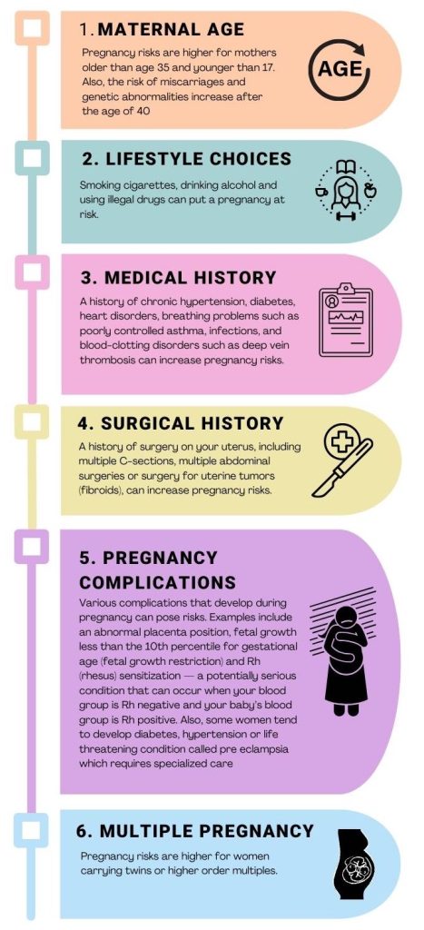 Risk factors may either be present before pregnancy or develop during the course of pregnancy. The following are some of the factors that may contribute to a high-risk pregnancy